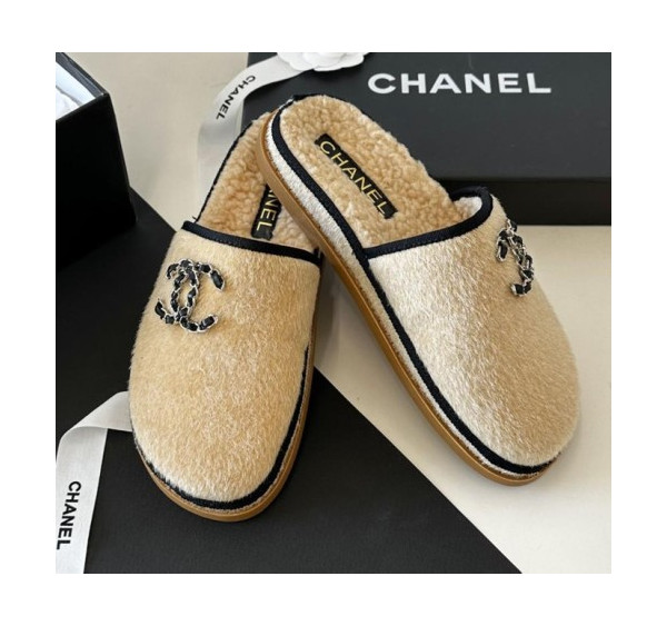 샤넬 체인 CC 로고 시어링 스웨이드 뮬 슬리퍼