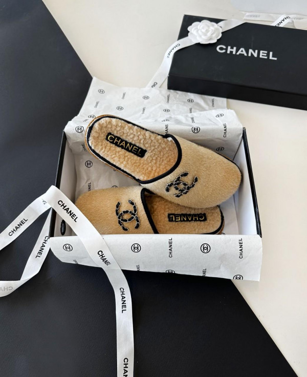 샤넬 체인 CC 로고 시어링 스웨이드 뮬 슬리퍼