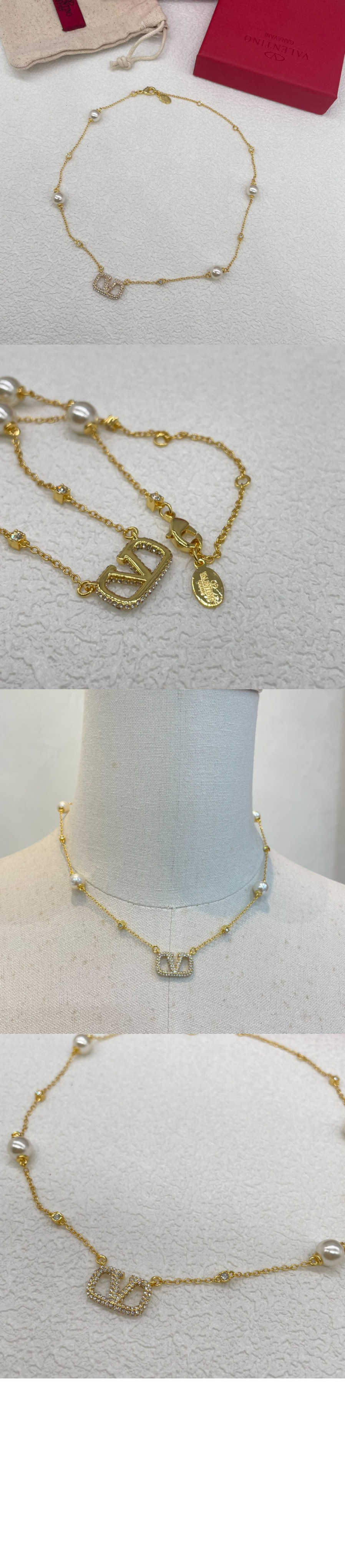 발렌티노 크리스털 및 진주 장식 브이로고 시그니처 메탈 네크리스 > 하이엔드 여성관